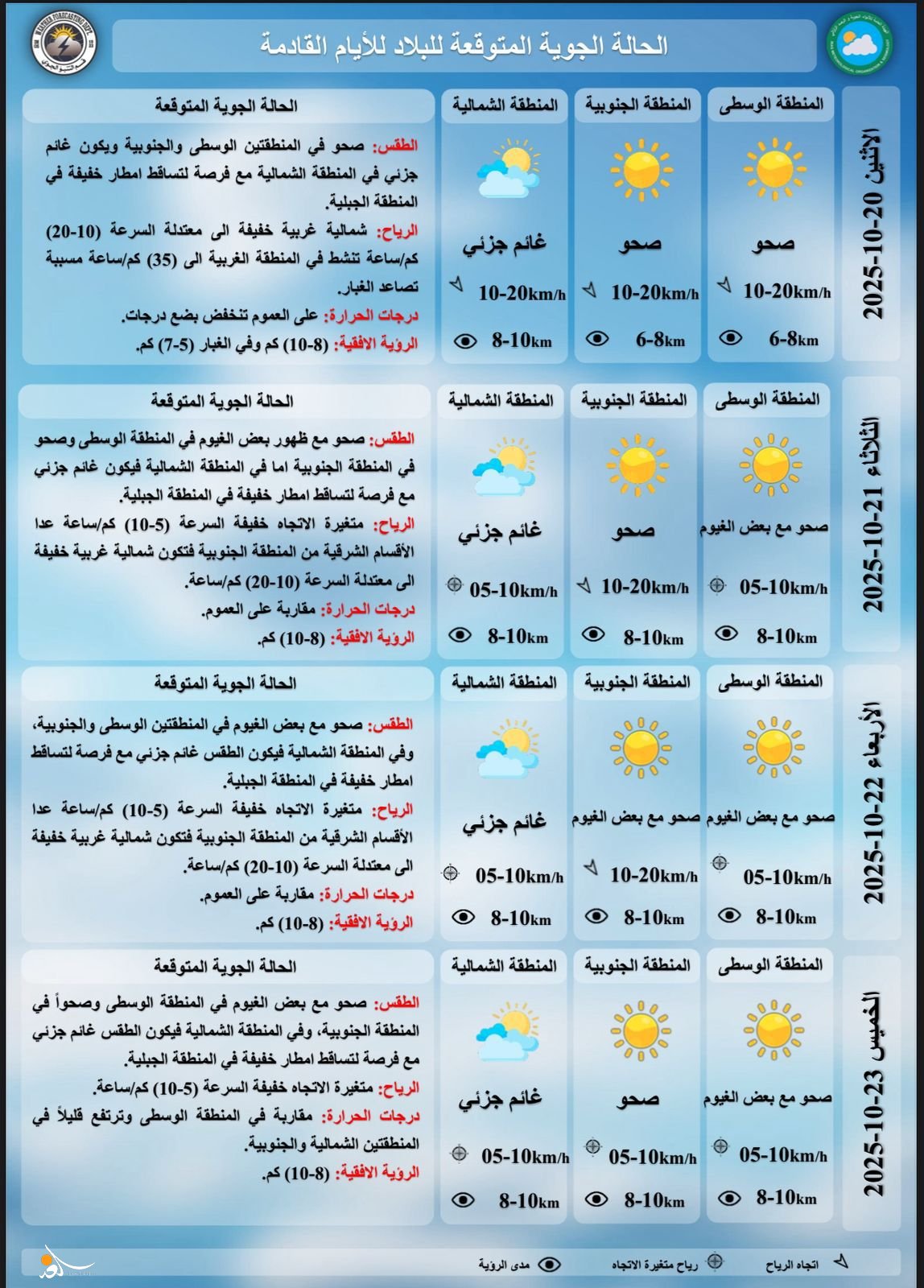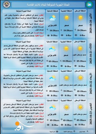 أصدرت هيئة الأنواء الجوية، الأحد، تقريراً عن حالة الطقس المتوقعة في البلاد للأيام الأربعة المقبلة وكما في أدناه: