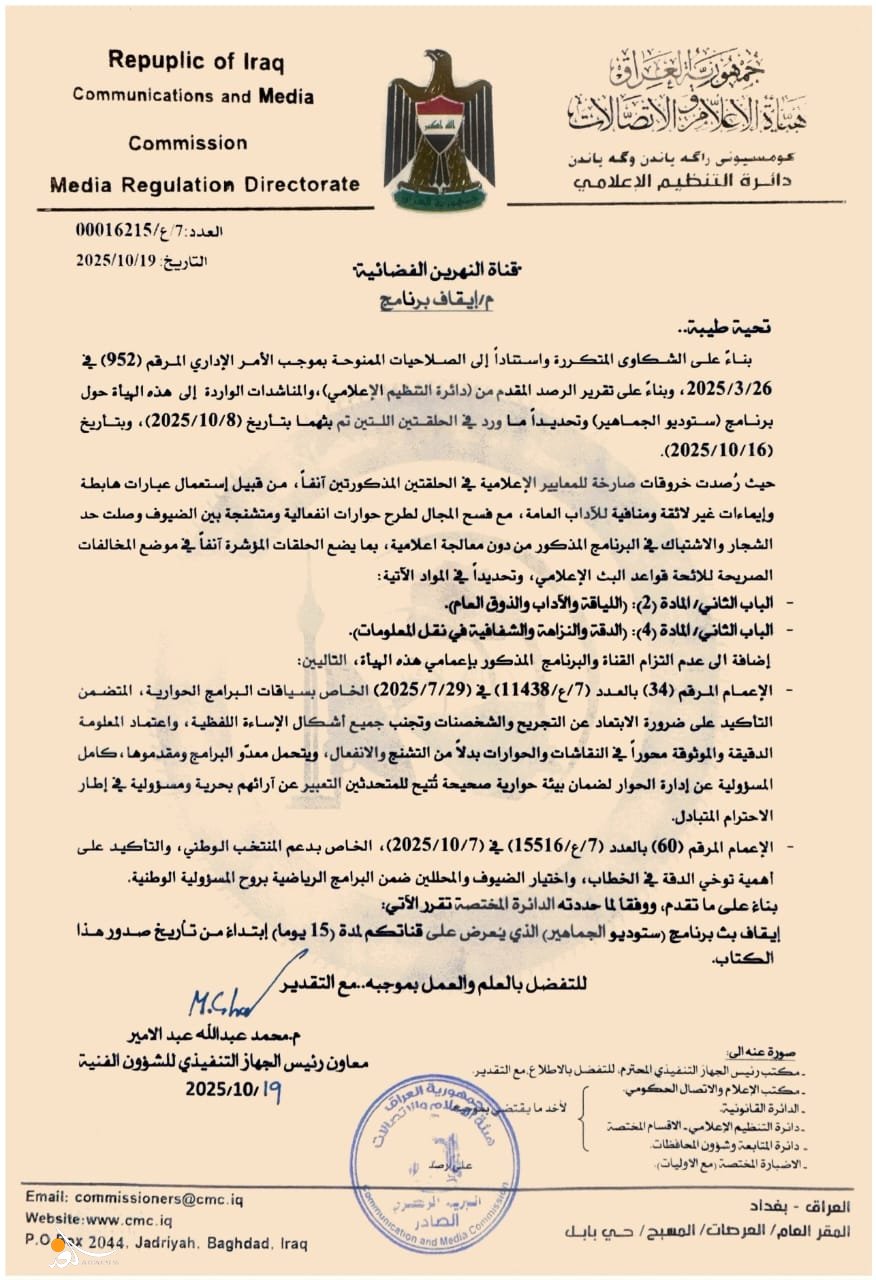 الغد برس/بغداد قررت هيئة الإعلام والاتصالات، اليوم الاحد، إيقاف برنامج ستوديو الجماهير الذي يقدمه الإعلامي الرياضي حيدر زكي، عبر قناة النهرين لمدة 15 يوماً.