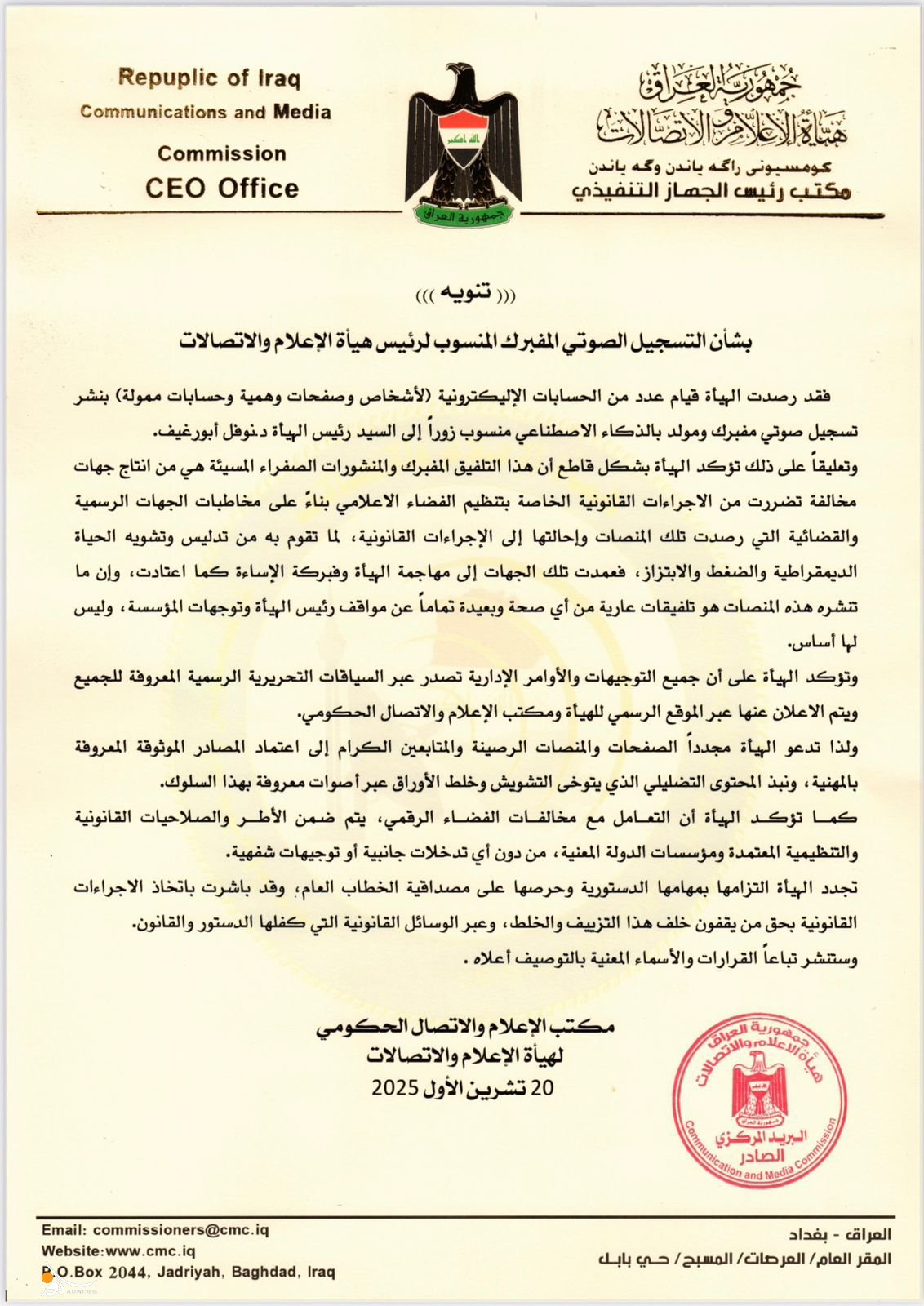 نفت هيئة الإعلام والاتصالات، اليوم الثلاثاء، التسجيل الصوتي المفبرك المنسوب لرئيس الهيئة نوفل أبو رغيف، فيما اكدت أن التسجيل مولد بالذكاء الاصطناعي.