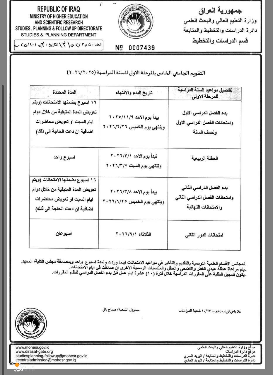 ونوَّه إلى أن "مدة الفصل الدراسي الأول، وفقًا للتقويم الجامعي للمرحلة الأولى، ستمتد لستة عشر أسبوعًا، وتنتهي يوم الخميس الموافق 26 شباط 2026".