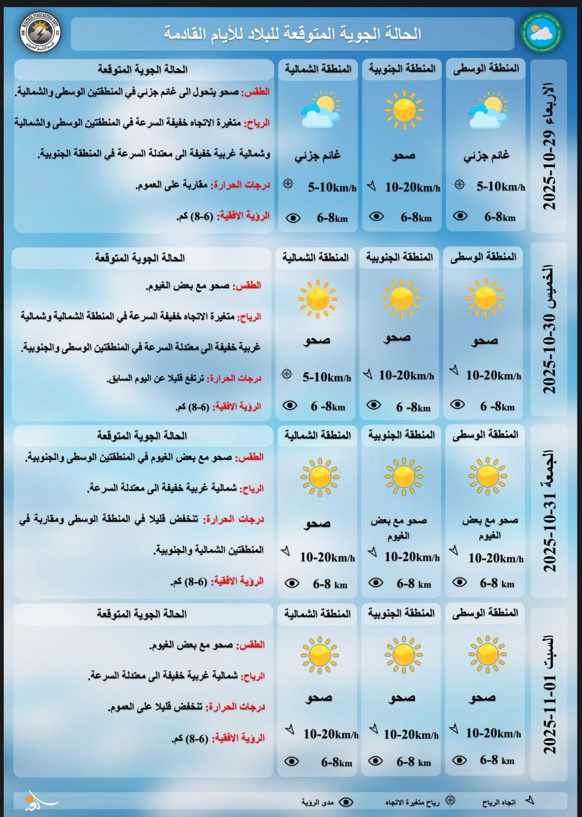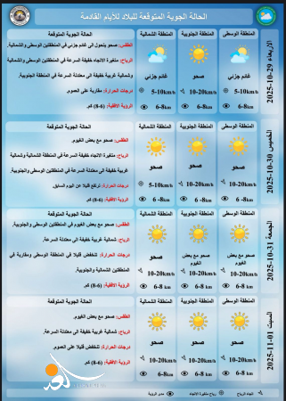 نشرت هيئة الأنواء الجوية، اليوم الثلاثاء، تقريراً تضمن توقعاتها لحالة الطقس في البلاد للأيام المقبلة.