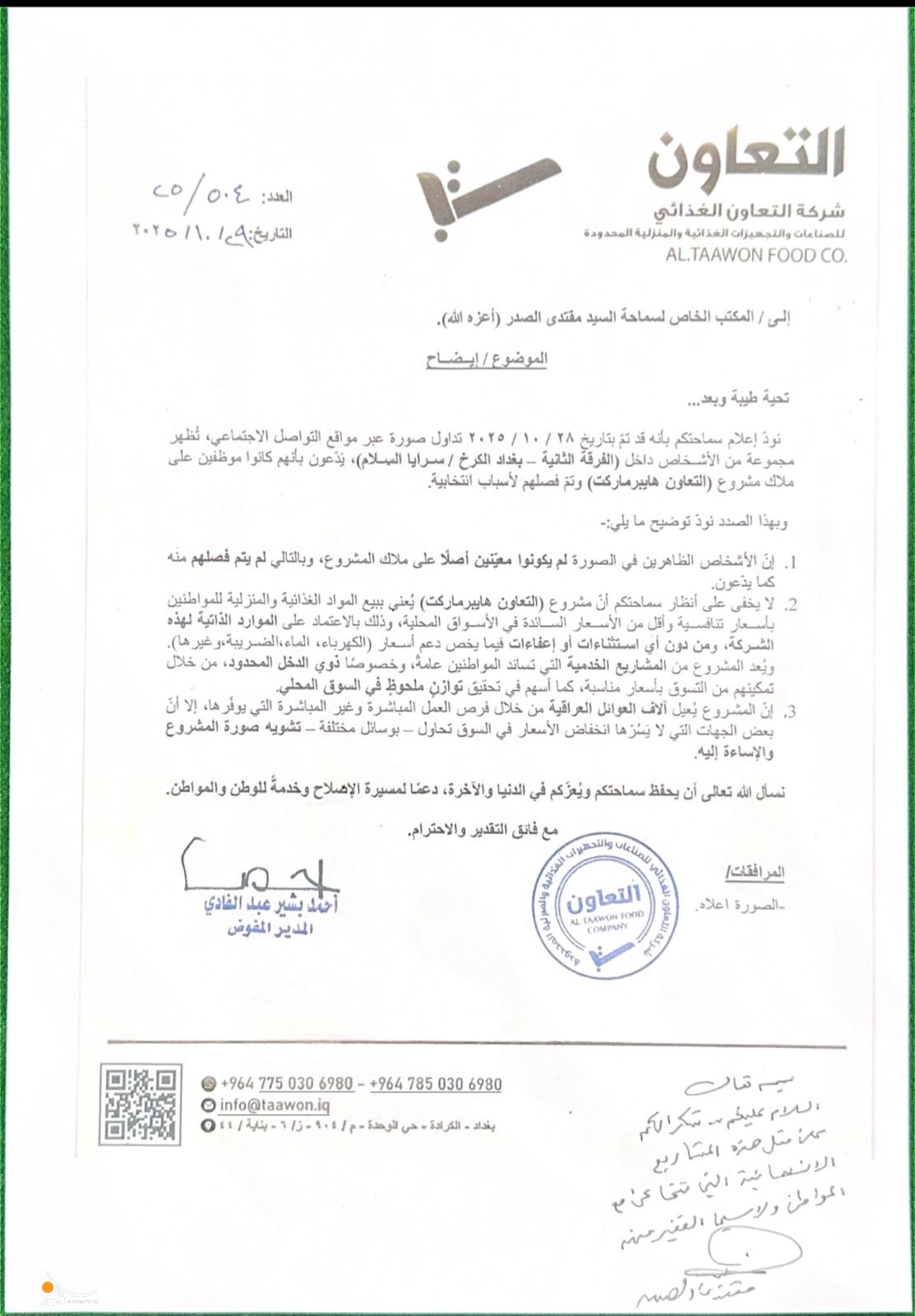 أشاد زعيم التيار الوطني الشيعي مقتدى الصدر، بأسواق "التعاون هايبر ماركت"، واصفاً إياها بـ"المشاريع الإنسانية".