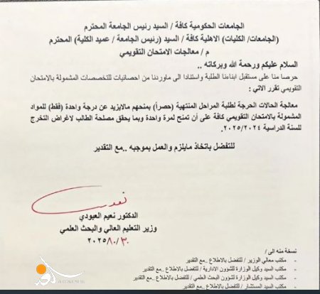 معالجة الحالات الحرجة لطلبة المراحل المنتهية حصرا بمنحهم ما لا يزيد عن درجة واحدة فقط للمواد المشمولة بالامتحان التقويمي كافة على أن تمنح لمرة واحدة وبما يحقق مصلحة الطالب لأغراض التخرج للسنة الدراسية 2025/2024.