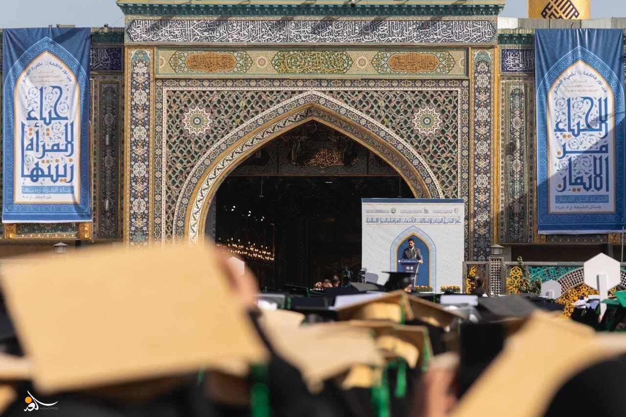 انطلقت في محافظة كربلاء المقدسة، اليوم الجمعة، فعاليات النسخة التاسعة من حفل تخرج طالبات الجامعات العراقية والدولية. وقال نائب الأمين العام للعتبة المقدسة عباس موسى، في كلمته خلال انطلاق فعاليات الحفل إن "العتبة العباسية المقدسة أقامت تحت ظلال قبة أبي الفضل العباس (ع)، النسخة التاسعة من حفل التخرج المركزي لطالبات الجامعات العراقية دفعة بنات الكفيل، في مشهد يزدان بالفخر والإيمان ويتوج برسالة العلم والعطاء". وأشار الى أن "الحفل يقام تحت شعار (من نور فاطمة -ع- نضيء العالم)، وللعام الدراسي 2024 / 2025، بمشاركة 5000 طالبة من 14 محافظة عراقية، إلى جانب مشاركة 231 طالبةً من 7 دول عربية وإسلامية هي (الكويت، سلطنة عمان، البحرين، السعودية، إيران، باكستان، لبنان)". وأضاف أن "الحفل يأتي ضمن سلسلة البرامج والأنشطة التي تركز عليها العتبة المقدسة في تعزيز انتماء الإنسان لدينه ووطنه وترسيخ قيم الإيمان والمعرفة، وهو يأتي ضمن نهجها في السير على خطى المرجعية الدينية وترجمة توجيهاتها المباركة في احترام الإنسان وربط المنجز العلمي بمنهج أئمة أهل البيت (ع)". وأوضح أن "تجمع الخريجات من المحافظات كافة يمثل أنموذجًا لأطياف الشعب العراقي، في مشهد يرسم وحدة الوطن ويجسد تنوعه، إذ تلتقي جميع الألوان على لوحة واحدة وهي لوحة العلم والولاية والإخلاص، كما أنَّ هذا الحفل يمتد من نجاح إلى نجاح حاملاً في طياته رسالة عميقة تؤكد أنَّ العلم لا ينفصل عن القيم، ويهدف إلى تعزيز منظومة الهوية الوطنية وروح الانتماء لدى المشاركات، وتخريج جيل يجمع بين العلم والوعي والمسؤولية". وتتضمن فعاليات الحفل في فترته الصباحية فقرات متعددة، منها أداء قسم التخرج وعهده عند مرقد أبي الفضل العباس (ع)، وتأدية مراسيم زيارته، ومسيرة بين العتبتين المقدستين الحسينية والعباسية، إلى جانب فقرات أخرى. أما فعاليات الفترة المسائية، فستقام في مجموعة العميد التربوية، وتتضمن إلقاء كلمات وقصائد، وعرضًا مسرحيًّا، بالإضافة إلى تكريم عدد من عوائل الشهداء، تثمينًا من العتبة المقدسة لبطولات وتضحيات الشهداء الذين جادوا بأرواحهم وأنفسهم من أجل العراق، ومواساة لعوائلهم. وتقيم العتبة العباسية المقدسة حفل تخرج دفعة بنات الكفيل، بهدف تقديم الدعم المعنوي للطالبات المتخرجات، واختتام مسيرتهن التعليمية وانطلاقتهن نحو الحياة العملية من رحاب أبي الفضل العباس (ع).