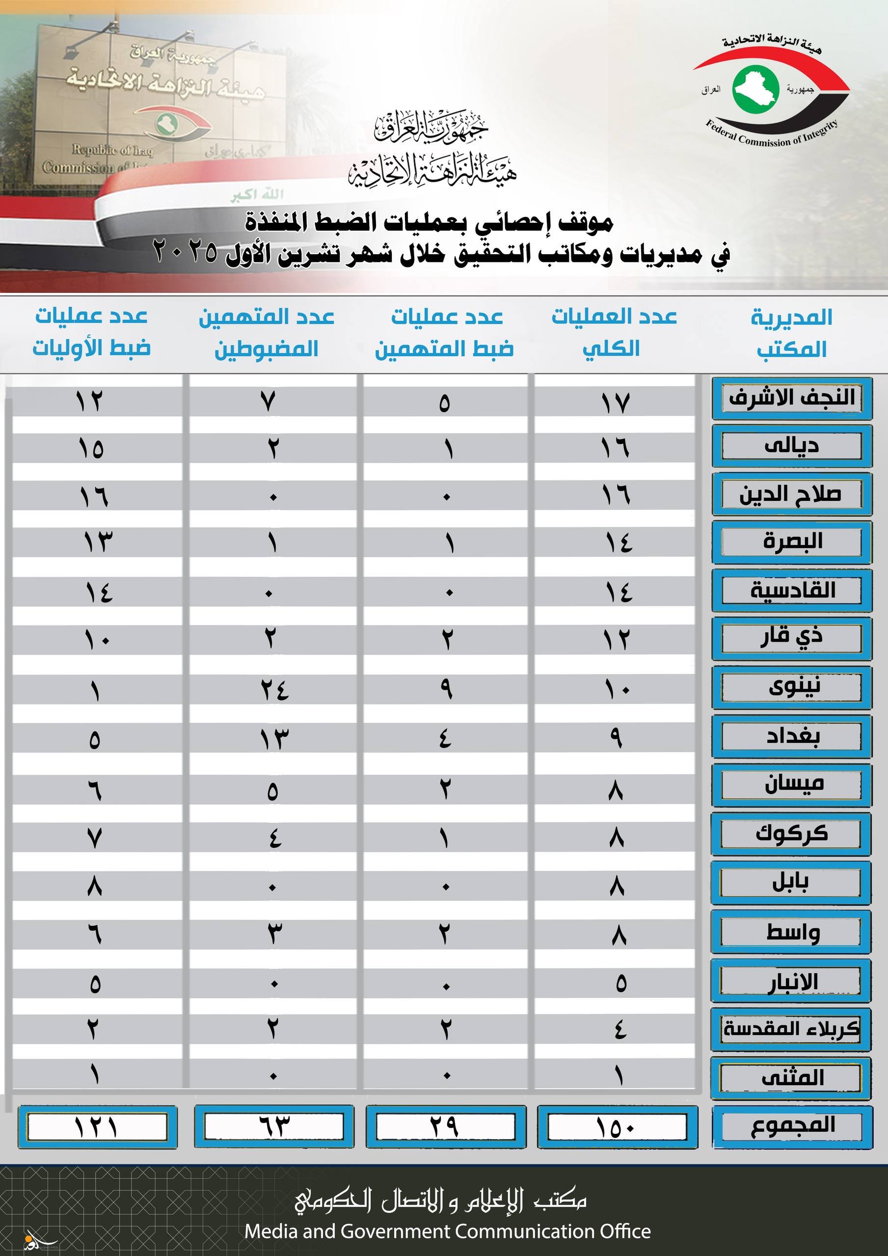 أعلنت هيئة النزاهة، اليوم الاحد، عن تنفيذ 150 عملية وتضبط 63 متهماً خلال تشرين الأول 2025.