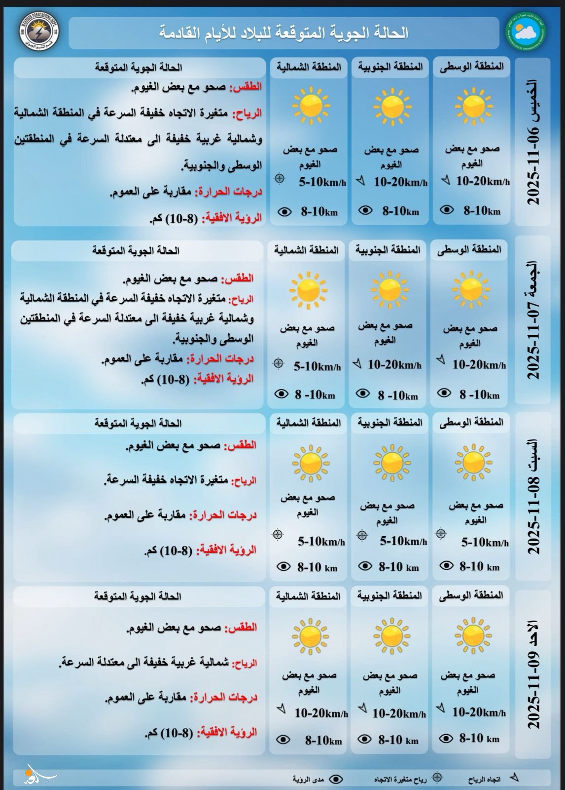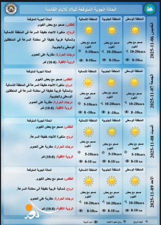توقعت هيئة الأنواء الجوية، الأربعاء، أن تشهد البلاد استقراراً في درجات الحرارة خلال الأيام الأربعة المقبلة.