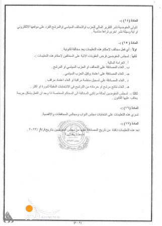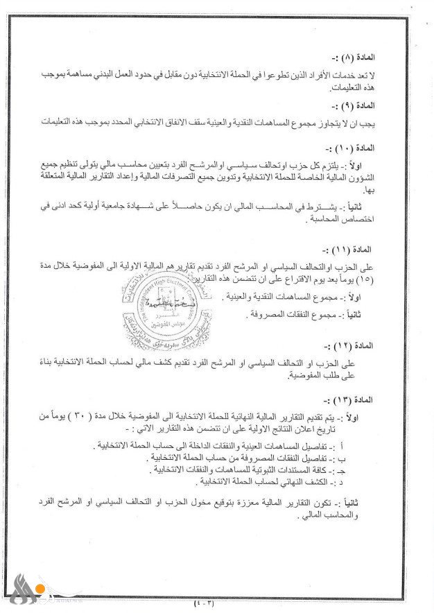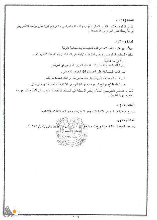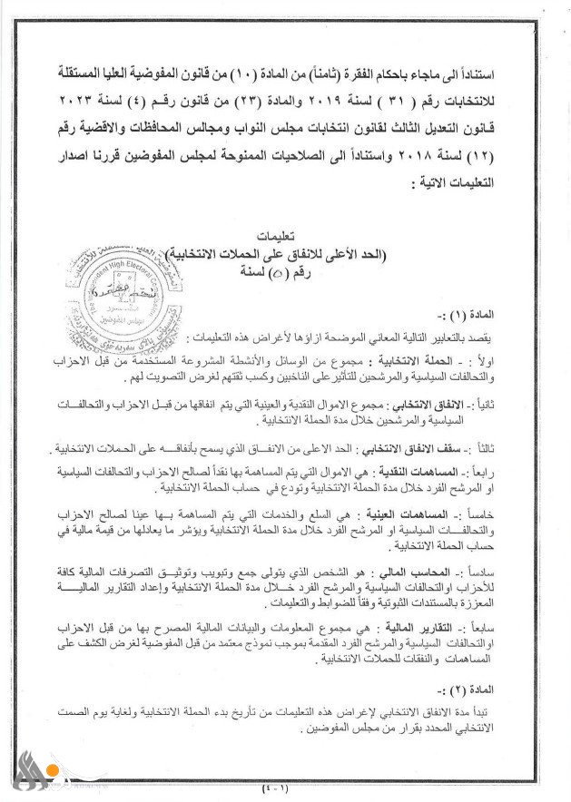 وذكر بيان للمفوضية، ورد لـ"الغد برس"، أنه "استناداً إلى ما جاء بأحكام الفقرة (ثامناً) من المادة الـ(10) من قانون المفوضية، رقم (31) لسنة 2019، والمادة (23) من قانون رقم (4) لسنة 2023، وقانون التعديل الثالث لقانون انتخابات مجلس النواب ومجالس المحافظات والأقضية رقم (12) لسنة 2018، واستناداً إلى الصلاحيات الممنوحة لمجلس المفوضين تقرر إصدار تعليمات بشأن الحد الأعلى للإنفاق على الحملات الانتخابية".