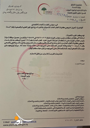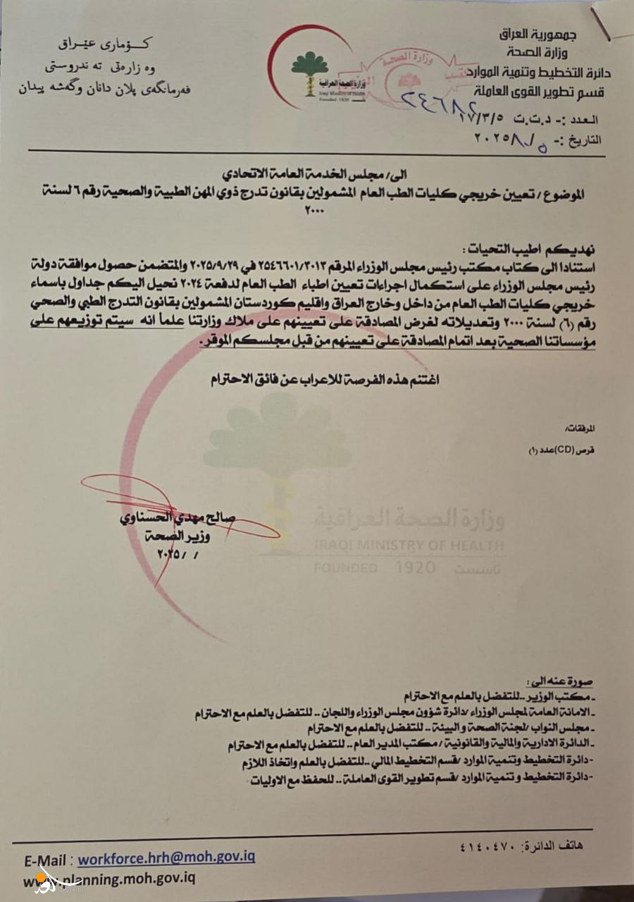 أعلنت وزارة الصحة، اليوم الاحد، استحصال موافقة رئيس الوزراء محمد شياع السوداني على استكمال إجراءات تعيين خريجي كليات الطب العام للدفعة 2024.