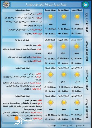توقعت هيئة الأنواء الجوية، انخفاض درجات الحرارة في البلاد بدءاً من يوم الخميس المقبل.