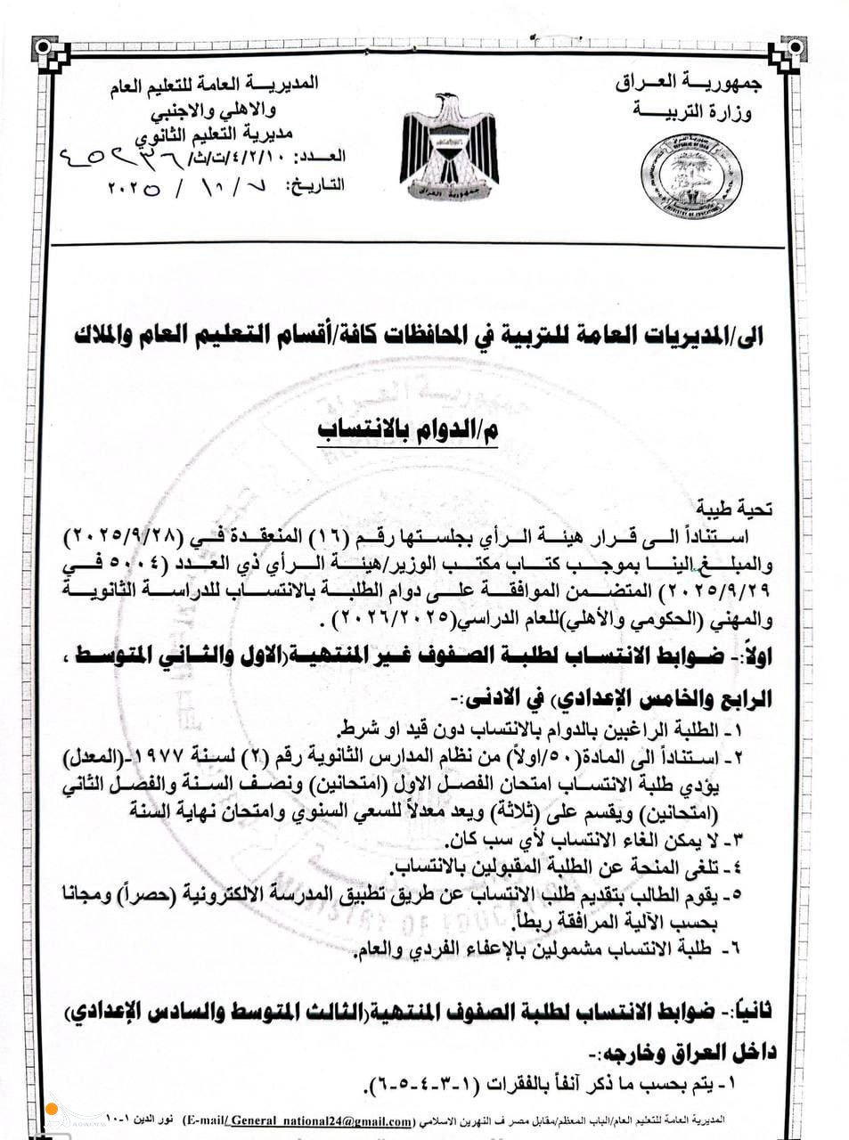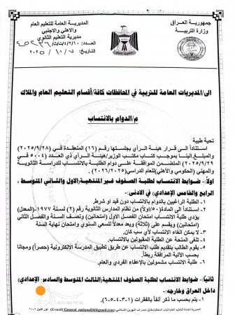 أعلنت وزارة التربية، اليوم الثلاثاء، عن ضوابط الدوام بالانتساب لطلبة المراحل الثانوية للعام الدراسي 2025–2026، فيما حددت نهاية شهر تشرين الثاني المقبل آخر موعد للتقديم.