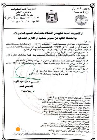 أعلنت وزارة التربية، اليوم الثلاثاء، فتح ابواب استضافة الطلبة من المدارس المسائية الى المدارس الصباحية للعام الدراسي 2025- 2026.
